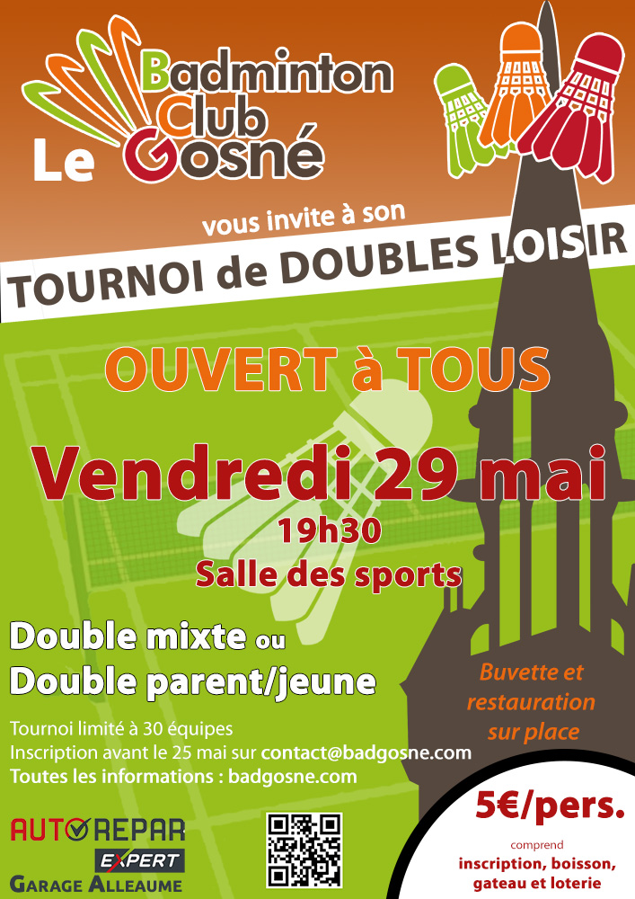 25 avril 2026Le club est heureux de vous inviter à son tournoi loisir, ouvert à tous, même aux non licenciés le vendredi 26 mai à la salle des sports de Gosné à partir de 19h30. Le tournoi se joue en double, soit avec une paire mixte adulte, soit une paire parent/jeune (moins de 16 ans) sans contrainte […] [...]